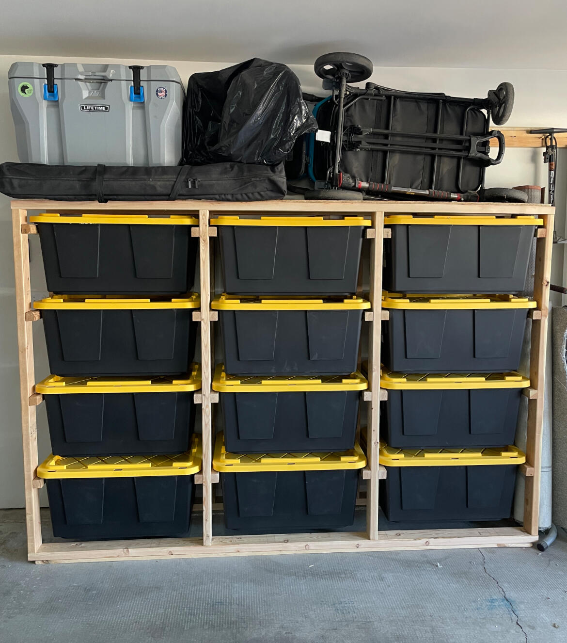 Plywood tops for workbench surfaces and top storage.